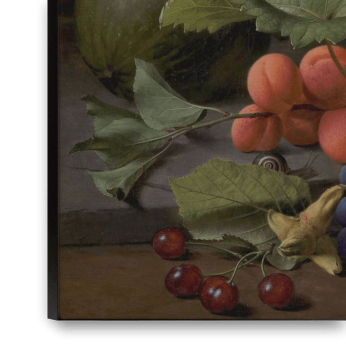 Bestelle Stilleben mit Früchten und einem Stieglitz, O.D. Ottesen als Reproduktion auf Leinwand, Alu-Dibond, als Poster, Fototapete oder Acrylglasbild.