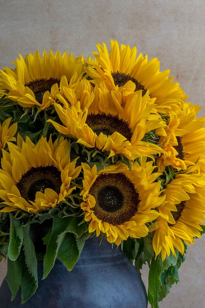 Dieses Stillleben mit Sonnenblumen hat einen beigen Hintergrund und ist im Hochformat.