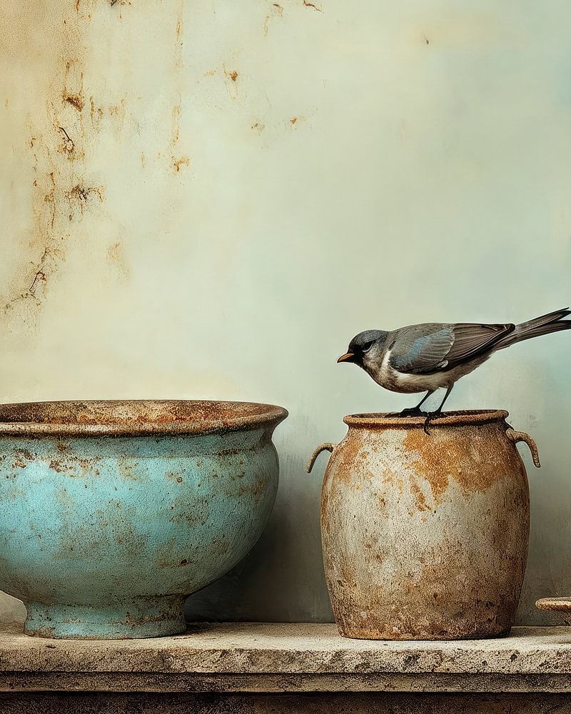 Stilleben mit einem Vogel auf einem Topf im Wabi-Sabi-Stil. Vor einem hellblauen verwitterten Hintergrund. Thema's: zen wabi-sabi minimalismus Japandi. Wählen Sie die Größe und das Material selbst und machen es zu Ihrem Interieur passen. Digitale Kunst.