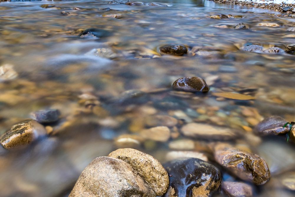 Langzeitaufnahme von einem Bachlauf in einer Tobel im Winter im Allgäu