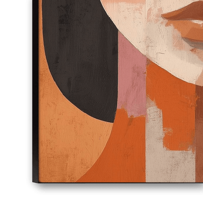 Abstraktes Porträt einer Frau, bestehend aus vertikalen Farbstreifen und ausdrucksstarken Pinselstrichen. Das Gesicht erscheint teils verborgen, teils enthüllt - als ob das Bild langsam aus den Farbschichten hervortritt. Die vorherrschenden Farben sind warm und vielschichtig: Orangetöne, Terrakotta, Rosa, Creme und Akzente in Schwarz. Das Auge, dunkel und scharf umrissen, zieht sofort die Aufmerksamkeit auf sich und verleiht dem Werk ein Gefühl von innerer Intensität.