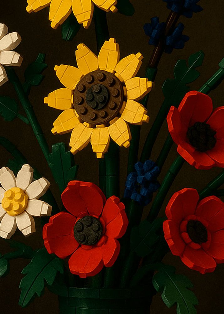Stilleben mit Sonnenblumen und Feldblumen aus Bauklötzen.