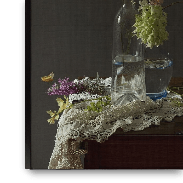 Stillleben vertikale Fotocollage einer Glasflasche und Karaffe mit Hortensie, Raps und Schmetterlingsblüte auf einem alten Häkelteppich mit herausgeschossener Petersilie. Alles vor einem dunklen Hintergrund. Wenn Sie genau hinschauen, können Sie Schmetterlinge und Insekten sehen.