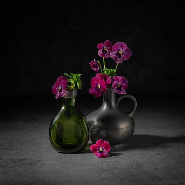 Über „Stillleben, Sweet Petit Veilchen in antiker Vase und Zinnkrug“ von Oda Slofstra