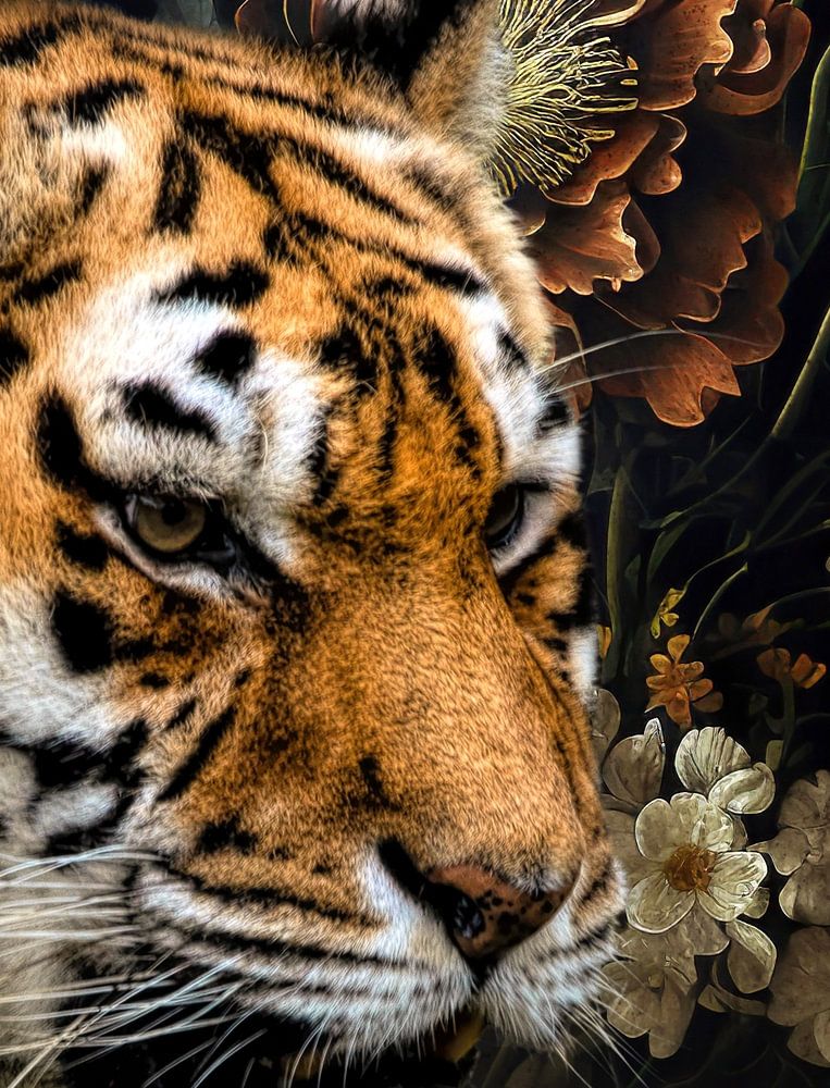 Foto eines Tigers digital manipuliert mit einem floralen Hintergrund Farben: Orange, rot, beige, weiß und schwarz Stillleben mit Blumen und ein Porträt eines Tigers Digital Art Schön in einem klassischen oder Hotel schicke Einrichtung
