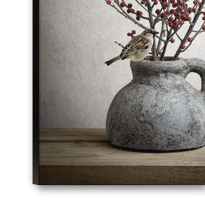 Modernes Stillleben einer Steinvase mit trocknenden Zweigen, Beeren und einem Haussperling