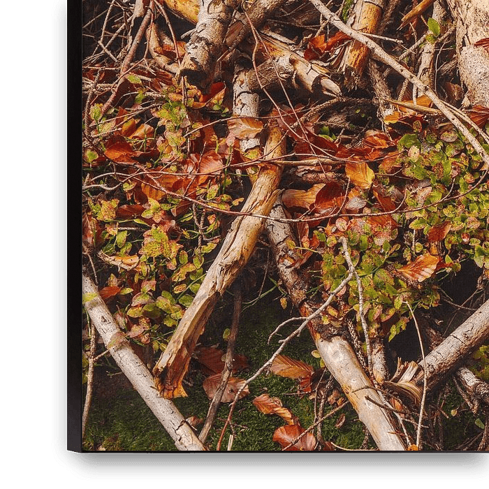 Alte Äste und buntes Herbstlaub langs des Weges bei einer Wanderung durch den herbstlichen Wald.