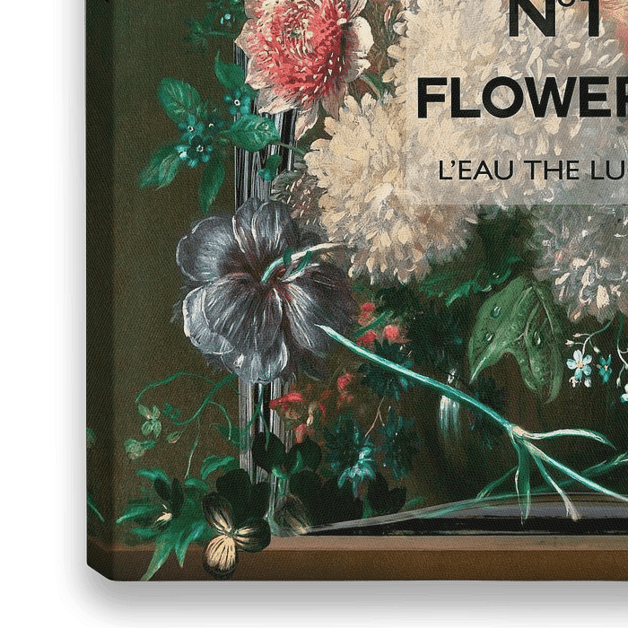 Stillleben mit Blumen aus dem Rijksmuseum in einer Parfümflasche. Ein digitales Bild in einer zeitgenössischen Version