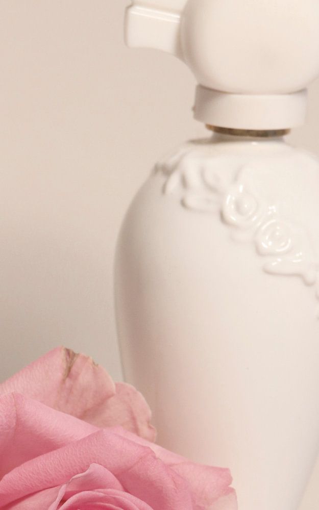 Stillleben mit einer rosa Rose und eine weiße Parfüm-Flasche. Weiß-Töne mit einem zarten rosa Farbe.