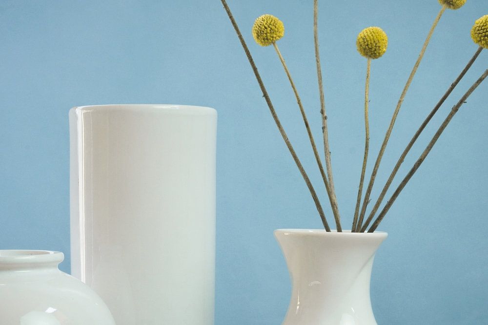 Ein erfrischendes Stillleben mit gelben Drumsticks oder Bullet-Look (Allium sphaerocephalon). Inspiriert von den Stillleben aus dem Goldenen Zeitalter. Die gelben Blümen bilden einen schönen Kontrast zur hellblauen Rückwand. Die weißen Vasen geben die Komposition. Kurz gesagt, ein Blickfang in Ihrem Interieur!