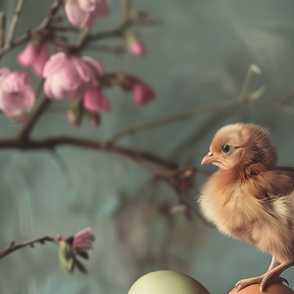 Stilleben im Vintage-Stil mit einem Küken, Eiern und Kirschblüten in Grün-, Rosa- und Burgundtönen.