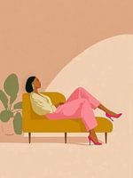 Ein modernes und elegantes Kunstwerk, in dem sich eine Frau entspannt auf einem stilvollen Sofa zurücklehnt. Die warmen Erdtöne werden mit sanften rosa Akzenten kombiniert, was für eine harmonische und zeitgemäße Ausstrahlung sorgt.