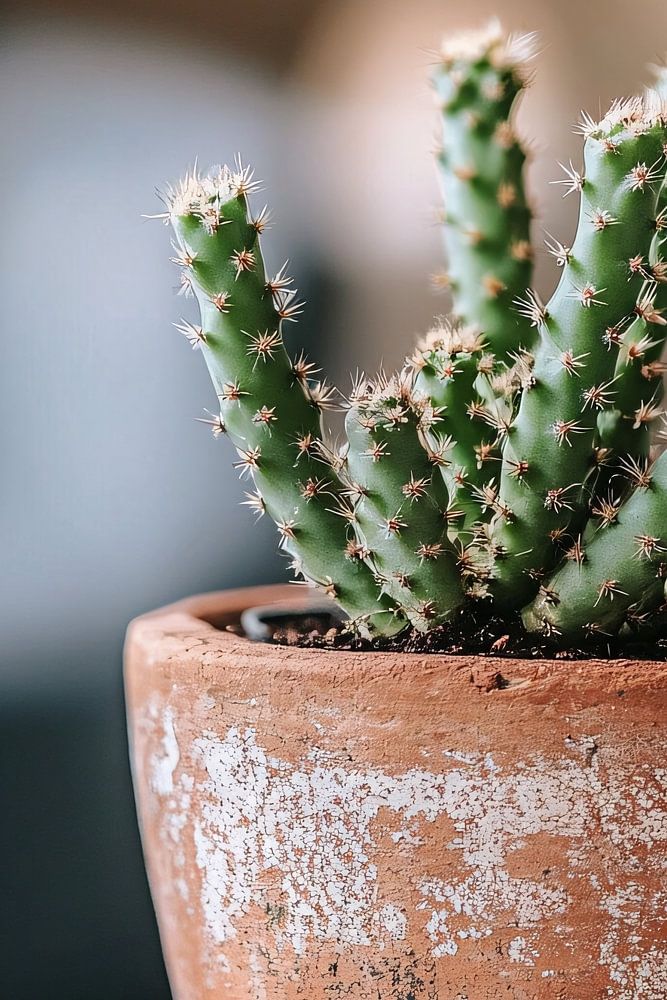 Ein stilvoller Kaktus in einem Steinguttopf bringt einen Hauch von Grün in jede Einrichtung. Das natürliche Aussehen des Topfes in Kombination mit der leuchtend grünen Farbe des Kaktus passt perfekt in moderne und minimalistische Wohnräume. Diese pflegeleichte Pflanze erfordert wenig Aufmerksamkeit und ist ideal für Büros, Wohnzimmer und andere Bereiche, in denen man gerne einen Hauch von Natur hinzufügt. Der subtile Farbkontrast zwischen der Keramik und dem Kaktus sorgt für ein beruhigendes Aussehen und macht ihn zu einer idealen Wahl für die Dekoration, ohne zu sehr ins Auge zu fallen.