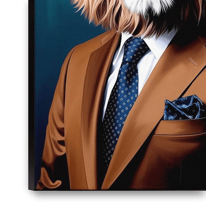 Dieses einzigartige Design zeigt einen majestätischen Löwen in einem stilvollen braunen Anzug mit einem eleganten weißen Hut und einer blau gepunkteten Krawatte. Die eindrucksvolle Kombination aus tierischer Kraft und menschlicher Raffinesse macht dieses Kunstwerk zu einem echten Hingucker. Der Löwe mit seiner prächtigen Mähne und…