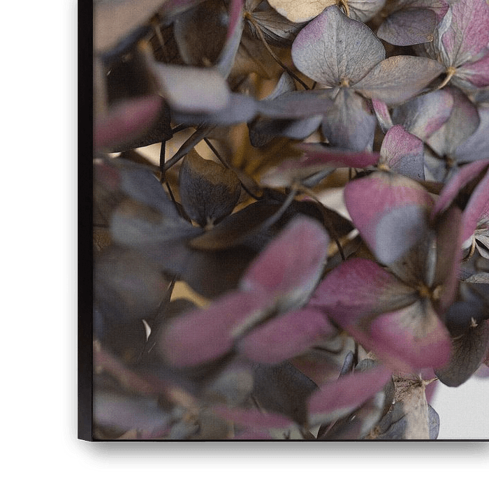 Ruhiges Foto von verbrauchten Hortensienblüten in einer Vase in lila-blauen Farbtönen. Schönes Licht auf den Blütenblättern.