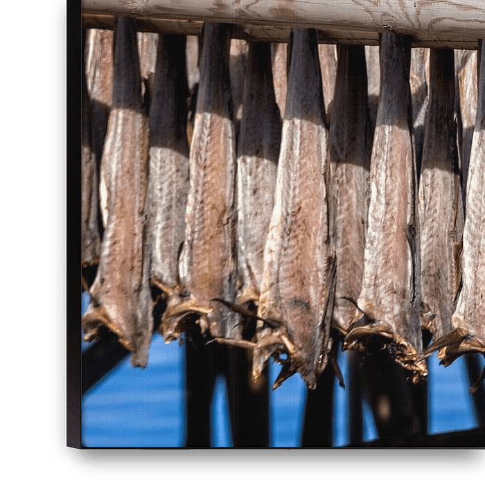 Stockfisch hängt zum Trocknen auf speziellen Gestellen im Freien auf den Lofoten in Nordnorwegen