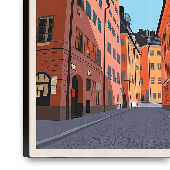 Zwischen den warmen, rot-orangefarbenen Fassaden der charmanten Gebäude entfaltet sich eine einladende Gasse, die zum Entdecken einlädt. Der strahlend blaue Himmel sorgt für einen frischen Kontrast, während ein Hauch von italienischem Flair die Szenarie durchzieht. Stockholm erstrahlt hier in zeitloser Schönheit und urbaner Eleganz.