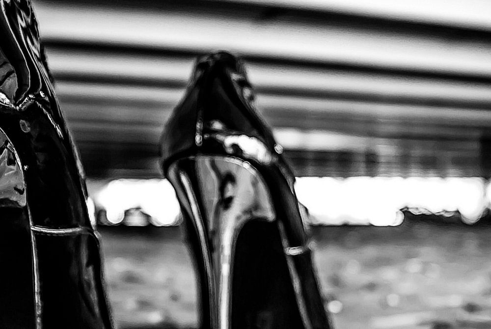 schwarze Pumps mit Absätzen in Chrom, in Nahaufnahme, in einem Parkhaus, aus der Serie "Abseits des Catwalks"