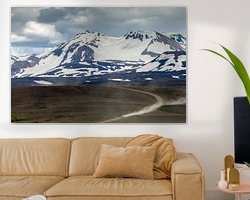 Een auto rijdt over de oververharder weg van de route "Kjolur" door het binnenland van IJsland. Achter zich het stof en de hoge bergen van IJsland.