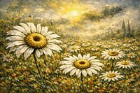 In diesem Kunstwerk, „Wervelwit“, trifft die Unschuld des Gänseblümchens auf die rohe Energie eines Sommergewitters. Die dicken, ausdrucksstarken Pinselstriche und der starke Kontrast zwischen dem tiefgrauen Himmel und den strahlend weißen Blütenblättern sorgen für eine Komposition, die niemals langweilig wird. Im Zentrum des Chaos…