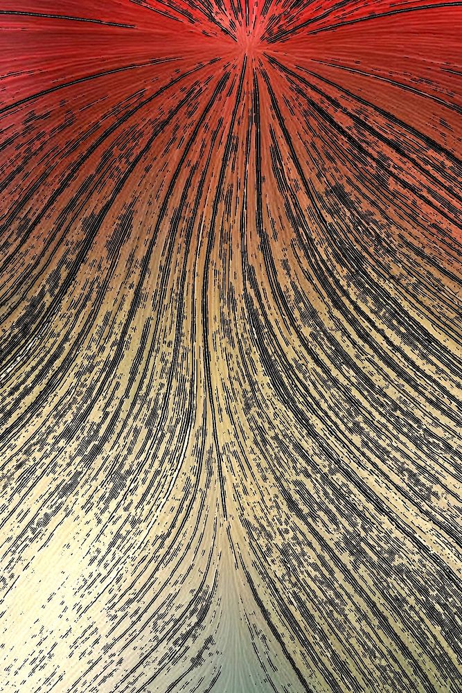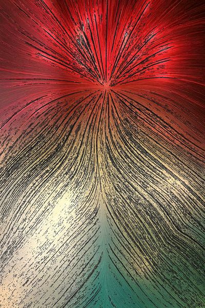 Dieses Kunstwerk zeigt einen kraftvollen, organischen Fluss von Linien, die sich von einem zentralen Punkt aus nach außen ausbreiten. Die warmen Rottöne im oberen Bereich gehen subtil in Beige- und Grüntöne über, wodurch ein dynamisches und doch harmonisches Gesamtbild entsteht. Die Textur und Bewegung wecken Assoziationen zu…