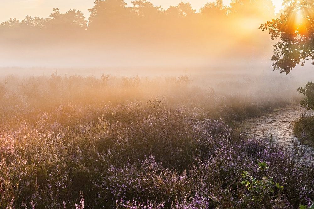 Die aufgehende Sonne, die durch die Äste der Bäume scheint, hat einen schönen Strahleneffekt. Das warme Licht umschmeichelt gleichsam die Heidelandschaft im Vordergrund, während in der Ferne noch Nebelfetzen über das Feld wabern.