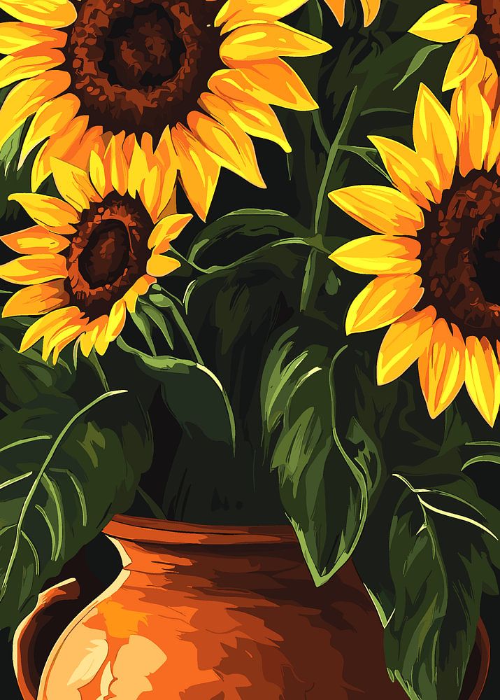 Das Motiv zeigt einen prachtvollen Sonnenblumenstrauß, der in einem rustikalen, terrakottafarbenen Keramikkrug arrangiert ist. Die leuchtend gelben Blütenblätter kontrastieren harmonisch mit den tiefgrünen Blättern und dem dunklen Hintergrund. Die natürliche Anmut der Sonnenblumen wird durch die feine Detailgenauigkeit der Blüten und die authentische Darstellung der Blätter unterstrichen. Dieses Werk fängt die Wärme und Lebendigkeit eines spätsommerlichen Tages in stilvoller, zeitloser Form ein.