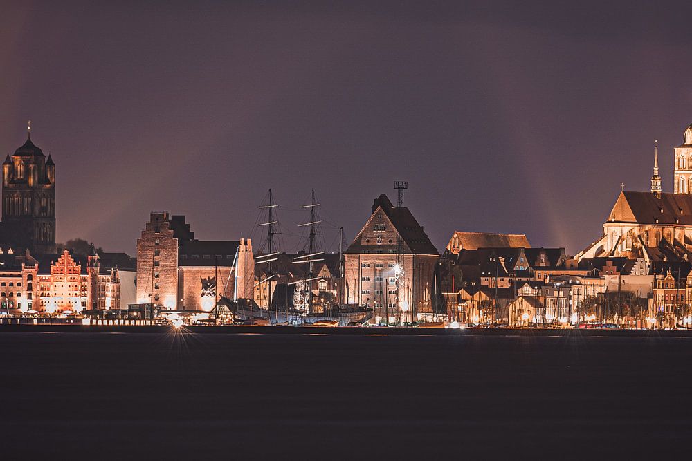 Blick über den Strelasund auf die Hansestadt Stralsund.