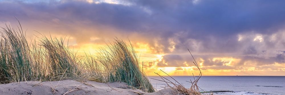 Ein Panoramablick auf den Strand und die Dünen bei Sonnenuntergang. Links das durch einen früheren Sturm beschädigte Strandhafer und rechts ein Blick auf die Nordsee.