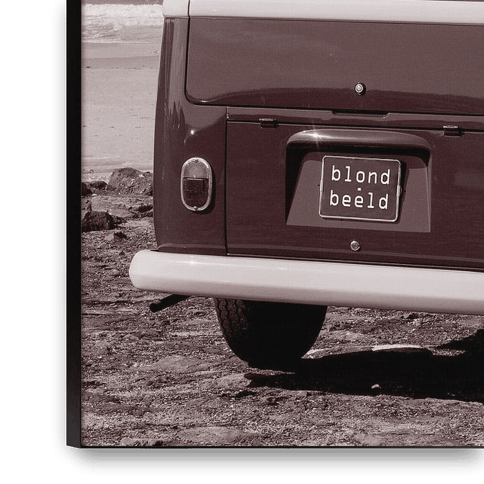 Strandatmosphäre Flowerpower mit Vw-Bus, Surfer und das Meer. Gehen Sie aus mit diesem stimmungsvollen Druck eines kultigen VW-Busses.