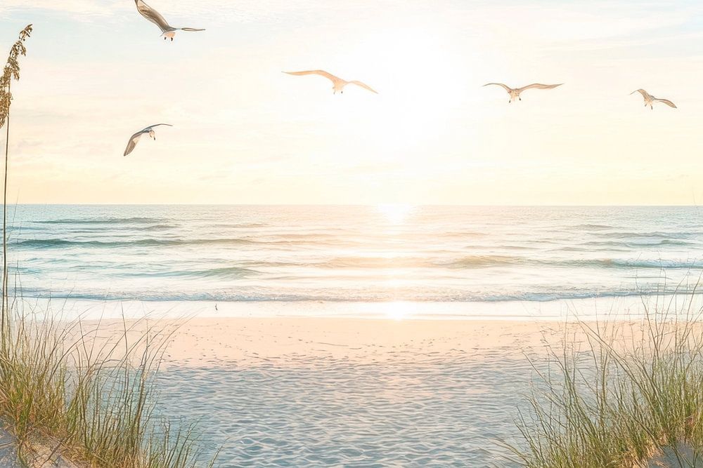 Ein sanfter Wind umschmeichelt die Dünen, während die Sonne golden über dem Horizont aufgeht. Das Licht tanzt auf den Wellen des ruhigen Meeres, und Möwen gleiten elegant durch den strahlend blauen Himmel. Grüne Halme wiegen sich im Sand, wo der Tag voller Möglichkeiten beginnt. Ein Ort der Erholung und des unendlichen Himmels.