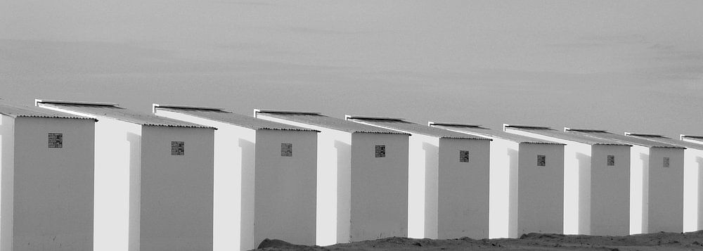 Strandkabinen an der belgischen Küste, schwarz-weiß