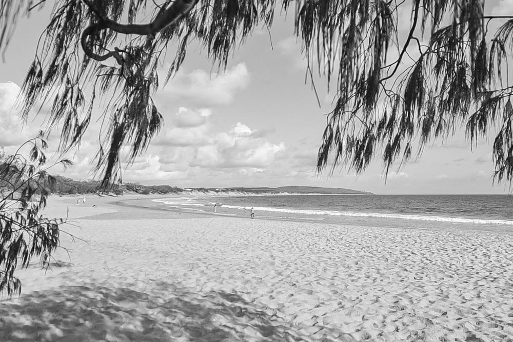 Wie schön, den Tag mit einem friedlichen Spaziergang am Strand zu beginnen. Schauen Sie genau durch diese Blätter und seien Sie dabei. Dieses Bild wurde in Agnes Water, Australien, aufgenommen.