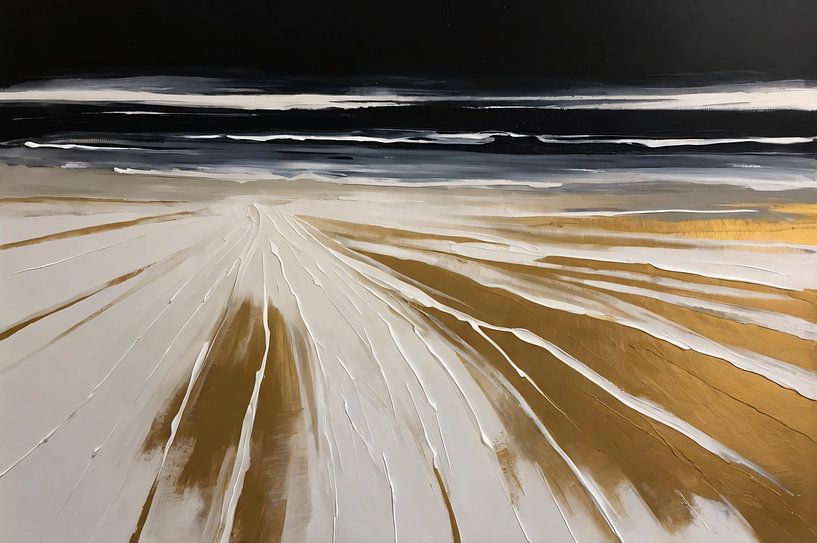 Bestelle dieses abstrakte Wandbild Strandszene mit Gold von Art & Soul Creations als Reproduktion auf Leinwand, Alu-Dibond, als Poster, Fototapete oder Acrylglasbild.