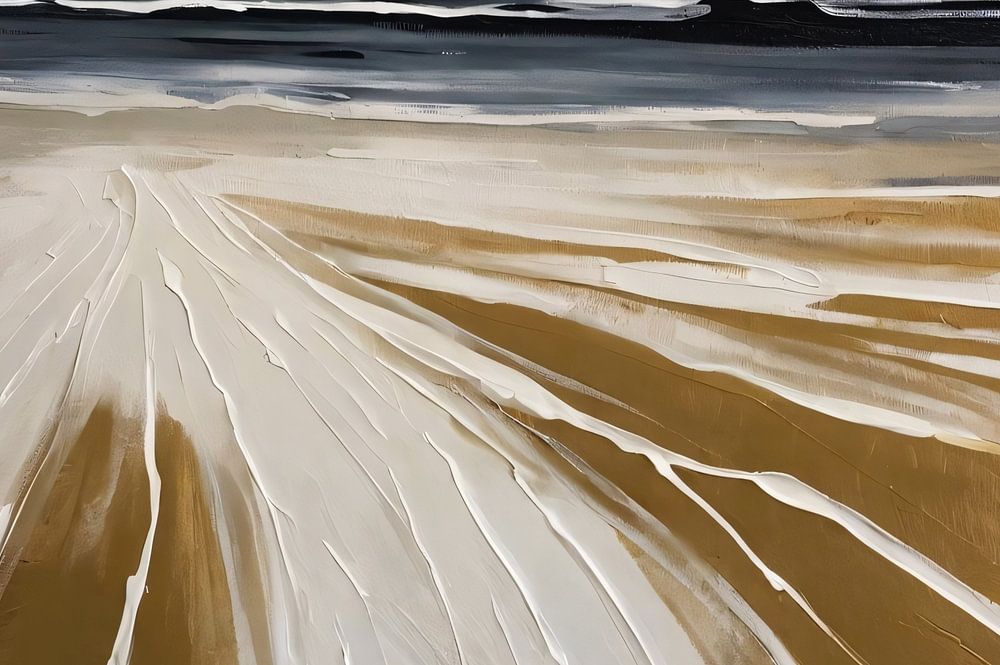 Entdecken Sie mit diesem einzigartigen Kunstwerk die ruhige Schönheit eines abstrakten Ansatzes in der Natur. Fließende Linien und weiche Farbübergänge schaffen eine minimalistische Strandszene, bei der das goldene Licht den Horizont sanft beleuchtet. Die abstrakten Formen und monochromen Töne regen die Fantasie an und laden den Betrachter zu einem Moment der Ruhe und Kontemplation ein. Dieses in seiner Einfachheit perfekte Gemälde ist eine subtile Erinnerung an den zeitlosen Charme der Küste und eine raffinierte Ergänzung für jedes moderne Interieur. Es lädt den Betrachter ein, die schlichte Pracht der Natur zu betrachten, die in einem zeitgemäßen und zugleich zeitlosen Stil festgehalten wurde.