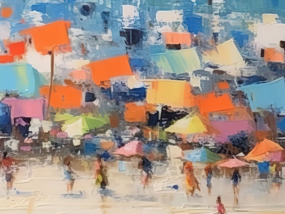Eine abstrakte Darstellung einer Strandszene. Die Elemente des Strandes, der Menschen und des Wassers sind nicht realistisch und abstrakt dargestellt, was dem Ganzen ein Gefühl von Bewegung und Emotion verleiht. Die Farbpalette des Gemäldes ist lebhaft und auffallend. Verschiedene leuchtende Orange-, Gelb-, Blau- und Rosatöne kontrastieren miteinander.