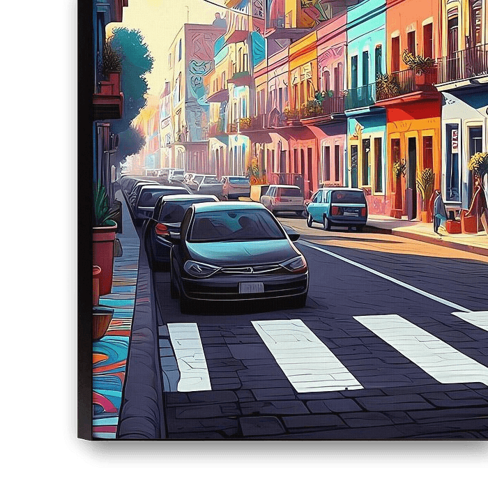 Das pulsierende Straßenbild besteht aus Gebäuden, die mit farbenfrohen Wandmalereien und verschlungenen Mustern verziert sind. Zu den lebendigen Mustern gehören Blumen und abstrakte Formen, die eine fröhliche Atmosphäre entlang einer sonnenbeschienenen Straße mit parkenden Autos schaffen.