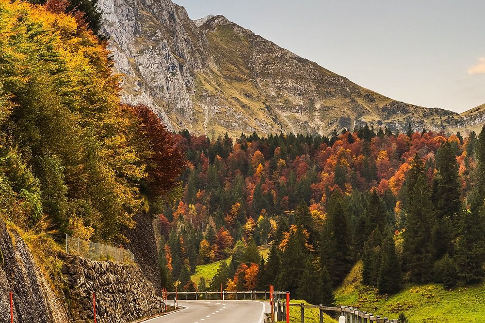 Die kurvenreiche Bergstraße zur Schwägalp in den Schweizer Alpen führt durch eine farbenfrohe Herbstlandschaft im Kanton Appenzell Ausserrhoden, Schweiz