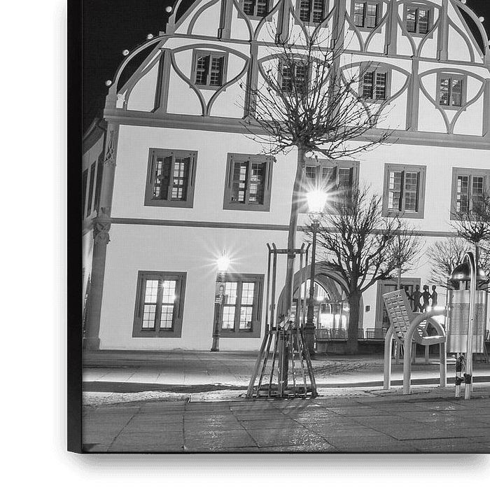 Straße in der Altstadt Zwickau mit altem Rathaus und Theater in der Nacht Schwarz -Weiß -Fotografie