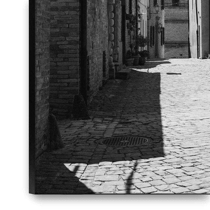 Straße in einem italienischen Bergdorf in den Marken. Das Foto hat eine schöne Maserung und ist in schwarz-weiß ausgeführt.