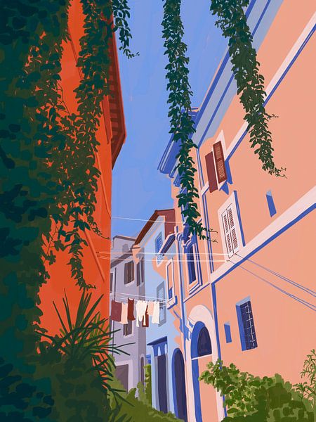 Ein warmes, sonniges und mediterranes Bild einer der vielen Gassen Roms, mit den typischen Wäscheleinen, farbenfroh gestrichenen Häusern und dem Grün, das dazwischen wächst. Diese Illustration entstand während einer Inspirationsreise nach Rom. Für uns Niederländer ist es ein Traum, im Oktober eine solche sommerliche Szenerie zu sehen!