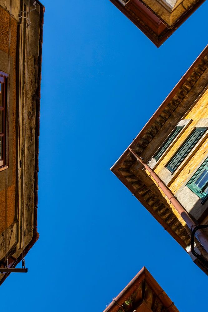 Vier Fassaden umrahmen einen klaren blauen Himmel, gesehen von einer engen Straße in Porto. Die Perspektive von unten hebt Linien, Farben und Texturen hervor und verleiht der Stadt einen fast abstrakten Charakter.