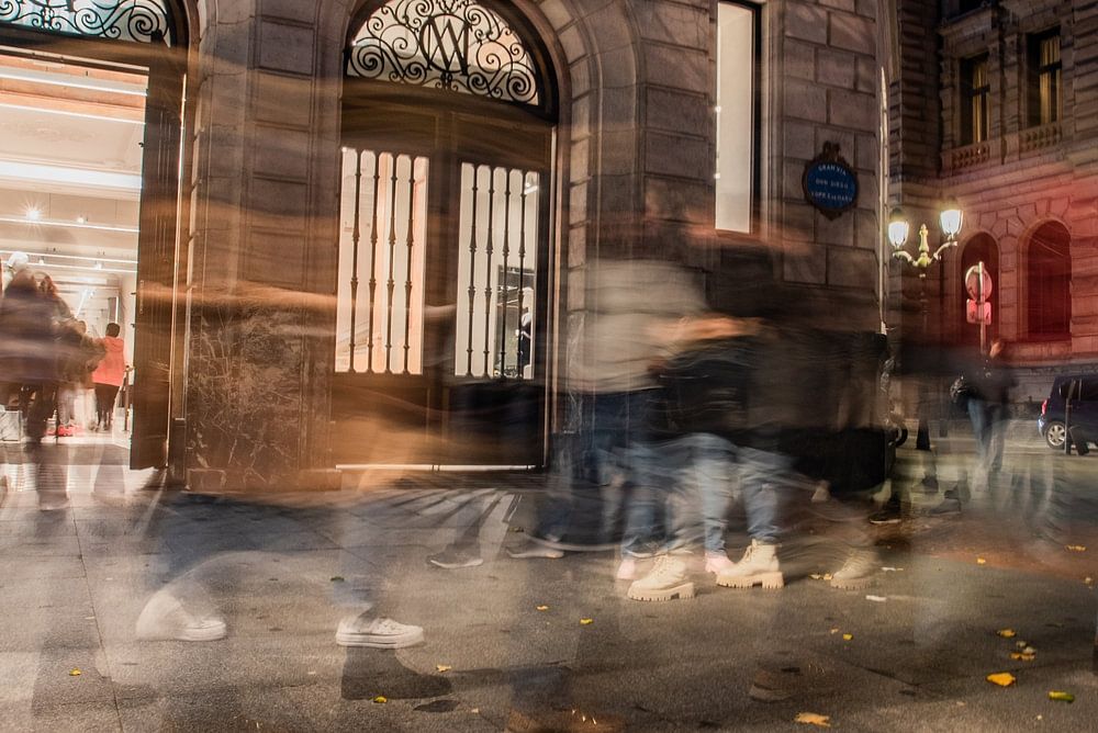Dies ist ein Foto der abendlichen Straßenszene mit Menschen, die vor der Tür von ZARA in Bilbao spazieren gehen. Die längere Verschlusszeit bringt Bewegung in das Foto und lässt die gehenden Menschen verschwimmen.