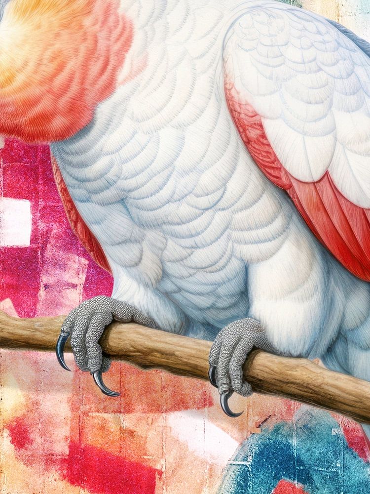 Moderne Kunst, wie Grafitti an einer Wand, kombiniert mit einem Vintage-Bild eines Kakadus.