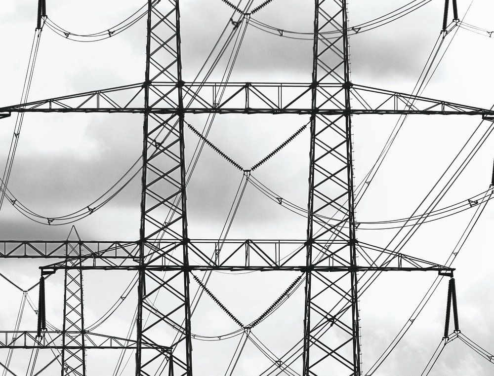 Strommasten mit Hochspannungsleitungen im Kontrast zu einem bewölkten Himmel.