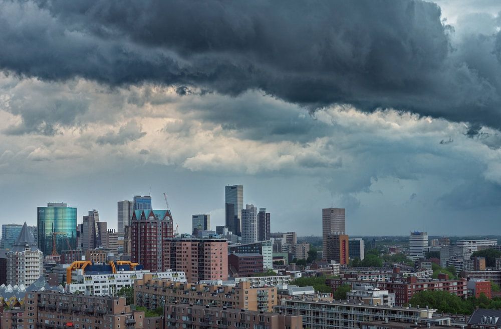 Dieser Schnappschuss fängt einen belebten Teil von Rotterdam während eines heftigen Sturms ein. Von einem Dach in der Stadt hat man einen Blick auf das Geschehen, wenn Skyline und Natur aufeinanderprallen.