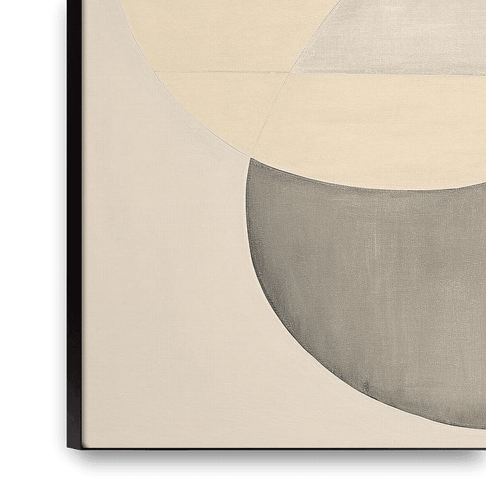 Silent Balance - Dieses Gemälde zeigt eine harmonische Komposition aus sich überschneidenden und nebeneinander liegenden Kreisformen mit einem minimalistischen und fast geometrischen Ansatz. Die Farben sind mit einer Palette von Beige, Grau, Schwarz und einem auffälligen Akzent in Ockergelb gedämpft und strahlen Ruhe und…