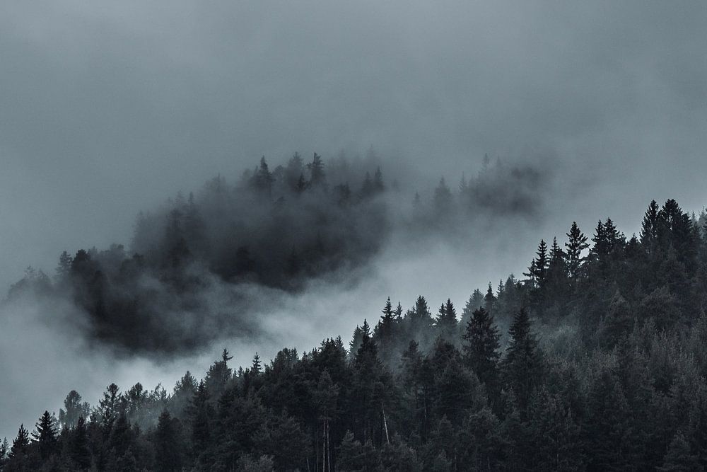 Ein Foto der tief über den Bäumen hängenden Wolken während eines aufkommenden Gewitters in den Alpen in Südtirol Italien. Ausrichtung im Querformat.