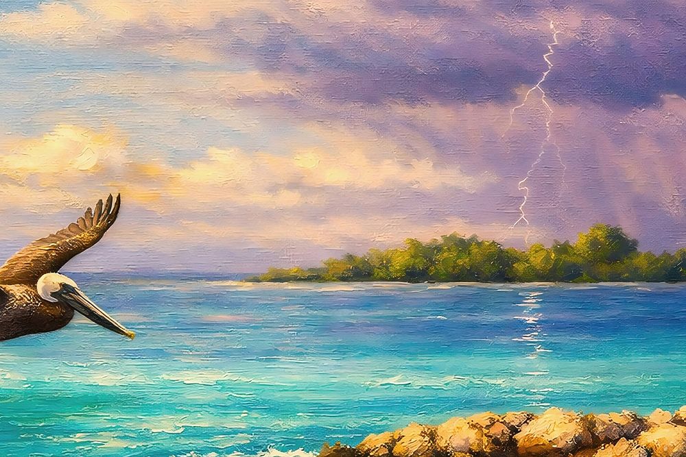 „Stormvlucht“ zeigt eine tropische Küste, über der ein brauner Pelikan tief über dem türkisfarbenen Wasser schwebt, während in der Ferne eine riesige Gewitterwolke bedrohlich aufzieht. Die digitale Nachbildung von Ölfarbstrukturen und der Impasto-Technik verleiht der Komposition Tiefe, was sich an den Flügeln des Vogels und den Felsen…