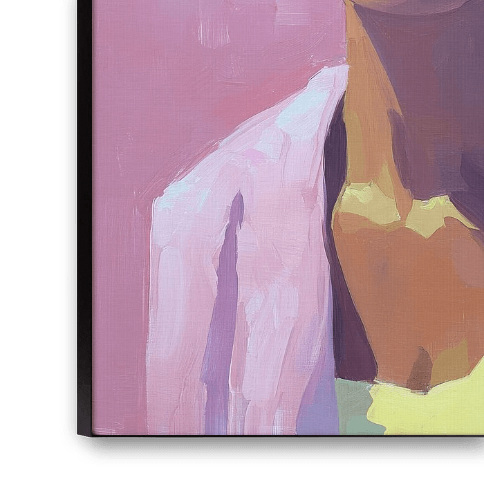 Dieses expressive Gemälde zeigt eine Frau mit hochgestecktem Dutt, die große, quadratische Sonnenbrillen trägt. Sie blickt direkt nach vorne und strahlt Selbstbewusstsein aus. Sie trägt eine weiße Jacke über einem hellgelben Oberteil, wobei lockere Pinselstriche Textur und Bewegung betonen. Der Hintergrund ist ein pastelliges Rosa mit sichtbaren Pinselstrichen, das die zentrale Figur plakativ hervorhebt. Die lockere, impressionistische Malweise mit kräftigen Farben und sichtbaren Pinselstrichen erzeugt Dynamik und moderne Ausstrahlung. Die Frau ist zentriert und steht klar im Fokus der Komposition.